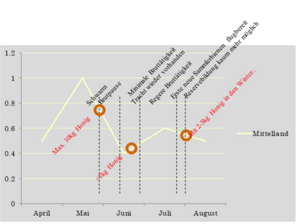 Eines der Hauptprobleme für Honigbienen ist, die sogenannten Trachtlücke. Ein Moment im Jahr, wo insbesondere wenig Nektar fliesst. Wie wir wissen, hängt der Bau- und der Bruttrieb der Bienen neben der Temperatur insbesondere vom eingehenden Nektarfluss ab. Gibt es nicht genügend Nektar in der Natur, stellt das Bienenvolk auf Notbetrieb, fährt den Bruttrieb herunter und baut nicht mehr. Dieser Entwicklungs-Knick lässt sich in einer Bienensaison durch das Volk nur noch schwerlich gutmachen.